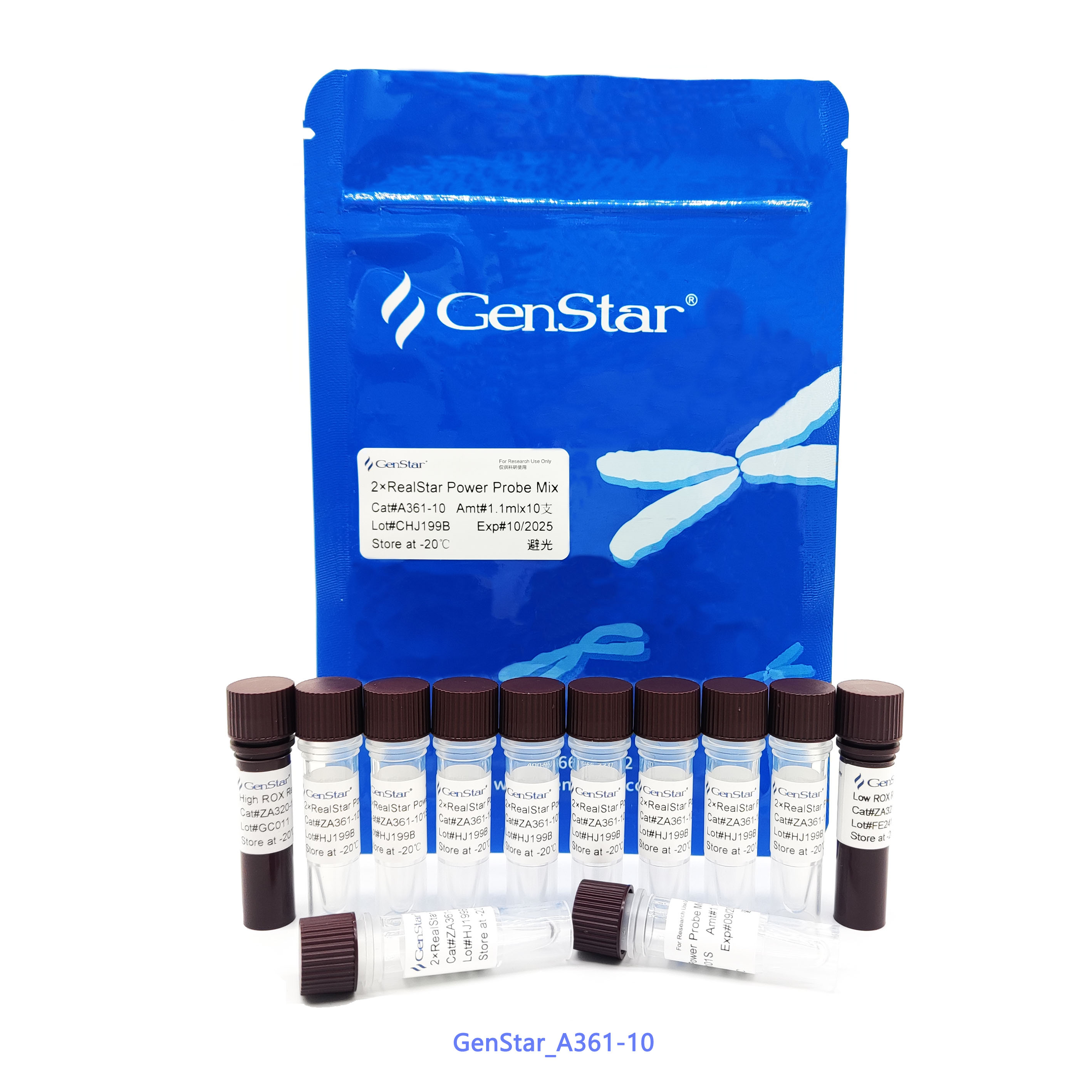 本產(chǎn)品是專用于探針法(TaqMan,Molecular Beacon 等)實時熒光定量的預混體系。產(chǎn)品含有優(yōu)化濃度的 GenStar Power HSTaq DNA Polymerase、dNTPs、Mg2+、反應緩沖液和穩(wěn)定劑等成分。Power HSTaq DNA Polymerase 在 75℃ 以下沒有活性,從而有效避免在常溫條件下由引物和模板非特異性結(jié)合或引物二聚體而產(chǎn)生的非特異性擴增,酶的激活需要 95℃ 孵育 10 min。反應體系可在室溫下配制,無需在冰上完成,操作方便。主要用于基因組 DNA 靶序列和 RNA 反轉(zhuǎn)錄后 cDNA 靶序列的檢測,如基因表達分析、拷貝數(shù)分析、SNP 基因型分析等,適用于不同類型探針法熒光定量 PCR。