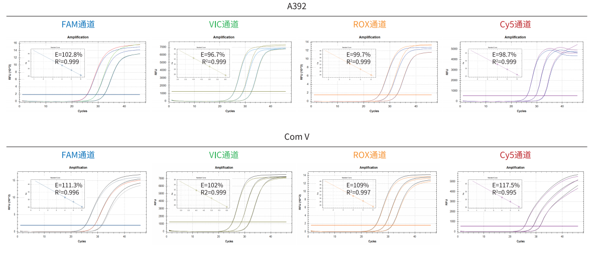 GenStar #A392 與 Com V 同時進(jìn)行四重 qPCR 檢測,結(jié)果顯示,四通道檢測結(jié)果均良好,尤其 FAM、Cy5、ROX 通道擴(kuò)增效率優(yōu)于 Com V。
