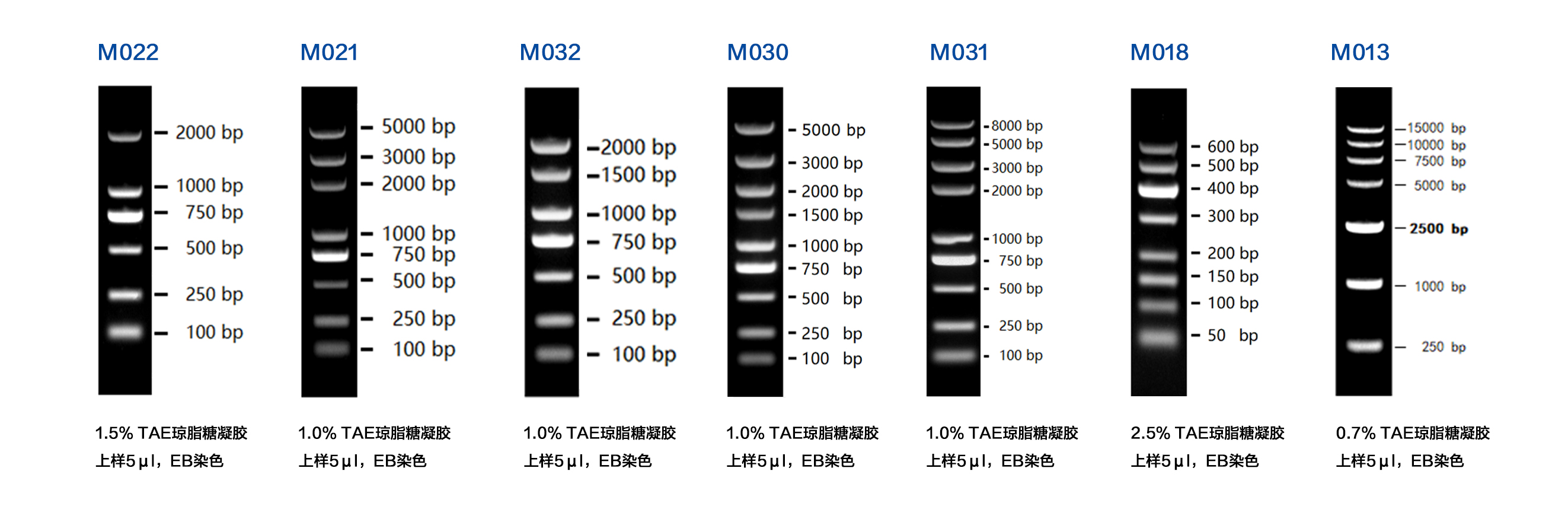 本產品為預混有 1× 上樣緩沖液的即用型 DNA 分子量標準,由 7 條線狀雙鏈 DNA 條帶組成,適用于對 250-15000 bp 的雙鏈 DNA 分子大小的估算和粗略定量。本產品的 7 條帶分別為 250、1000、2500、5000、7500、10000 和 15000 bp。其中 2500 bp 條帶濃度最大,為 20 ng/µl,其余條帶濃度約為 10 ng/µl。