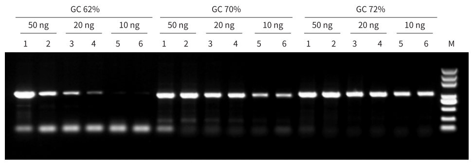 以小鼠 gDNA(50 ng、20 ng、10 ng)為模板,使用 A008 擴(kuò)增不同 GC 含量的目的片段。結(jié)果顯示,A008 對高 GC 含量的片段擴(kuò)增能力強(qiáng)