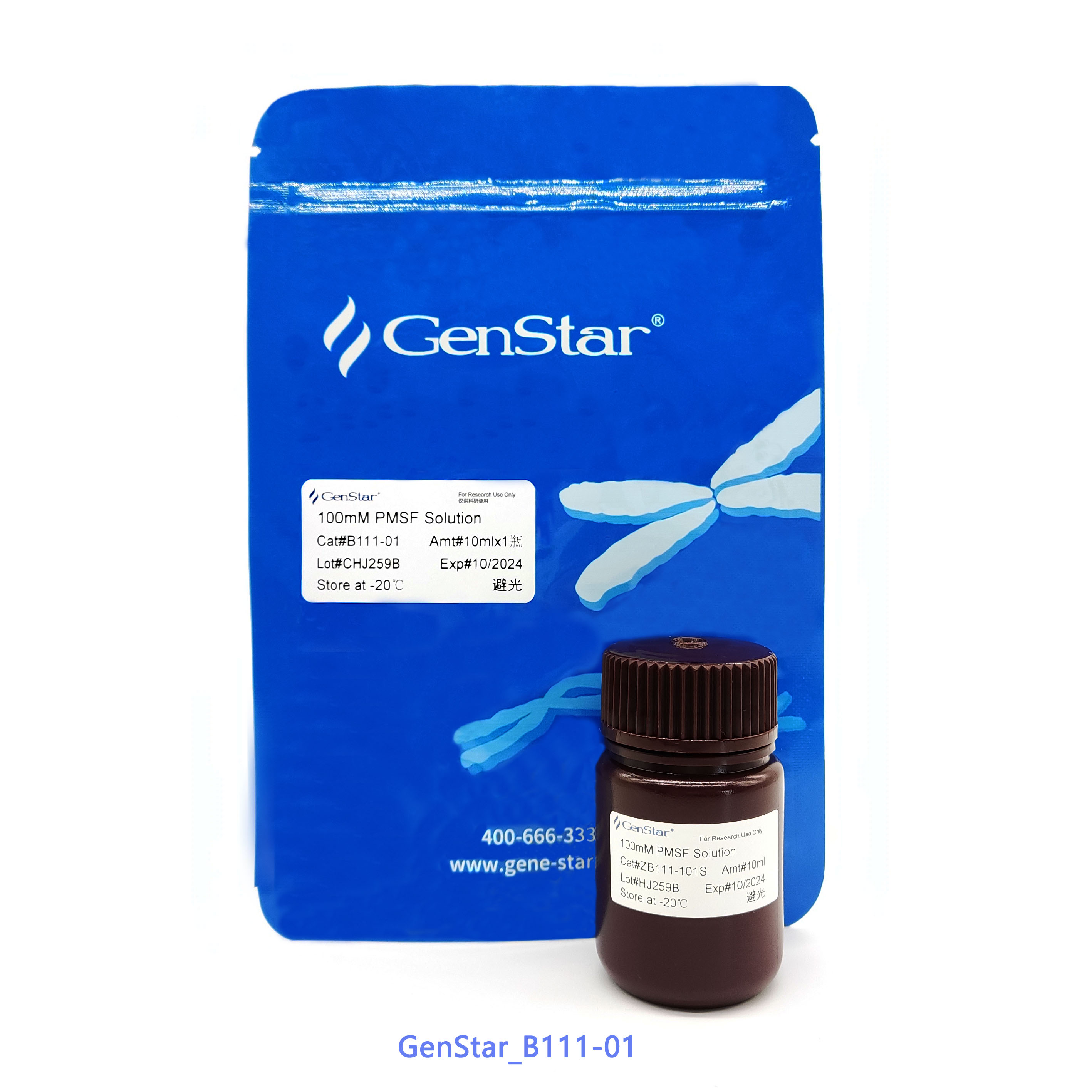 PMSF(苯甲基磺酰氟)可抑制絲氨酸蛋白酶磺化的絲氨酸殘基的活性部位,是絲氨酸蛋白酶(如胰蛋白酶,胰凝乳蛋白酶,凝血酶)和巰基蛋白酶(如木瓜蛋白酶)等酶的不可逆非特異性抑制劑。但不抑制金屬蛋白酶、大多數(shù)的半胱氨酸蛋白酶或天冬氨酸蛋白酶。故 PMSF 通常用于制備細胞裂解液,有助于保護樣品免受蛋白酶及其他酶的消化功能的影響。PMSF 也可用于在進行 Western blotting 之前從組織和細胞中制備蛋白質提取物。 本產(chǎn)品為 100 mM 的儲存液,溶劑為異丙醇。通常,1 mM 最終濃度能提供足夠的蛋白酶保護。使用時建議按照 1:100 添加至 RIPA 裂解液系列產(chǎn)品(GenStar#E121、E122、E123)、NP-40 裂解液(GenStar#E124)、Western 及免疫沉淀用細胞裂解液(GenStar#E125)。