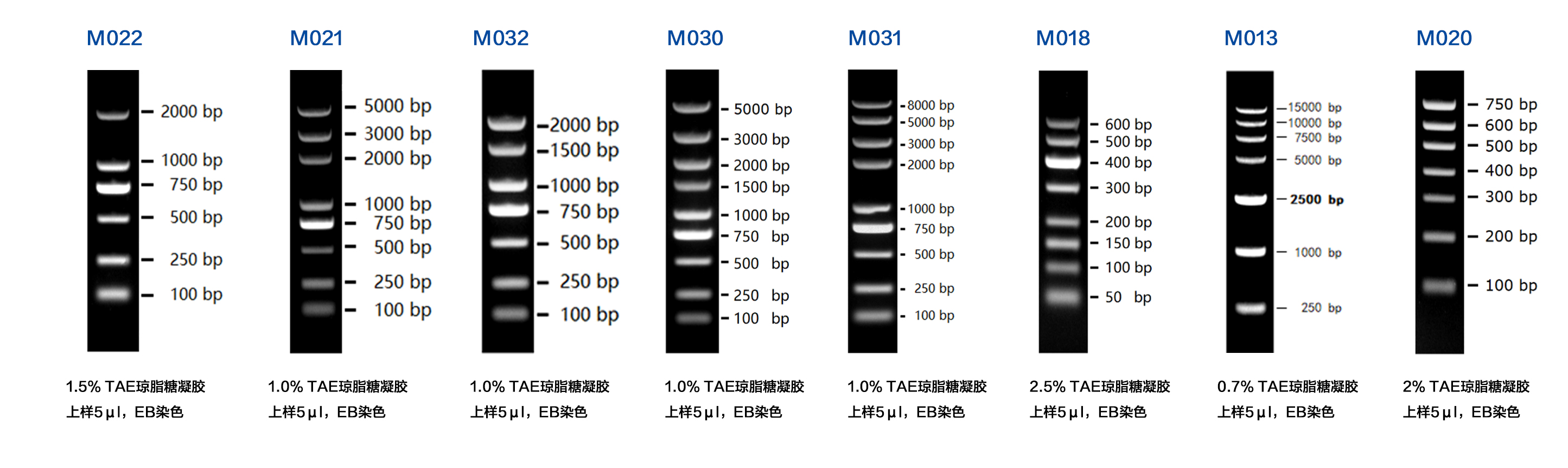 本產(chǎn)品為預(yù)混有上樣緩沖液的即用型 DNA 分子量標準,由 8 條線狀雙鏈 DNA 條帶組成,適用于對 100-5000 bp 的雙鏈 DNA 分子大小的估算和粗略定量。本產(chǎn)品的 8 條帶分別為 100、250、500、750、1000、2000、3000 和 5000 bp。其中 750 bp 條帶濃度最大,為 100 ng/5 µl,其余條帶濃度約為 50 ng/5 µl。