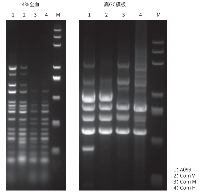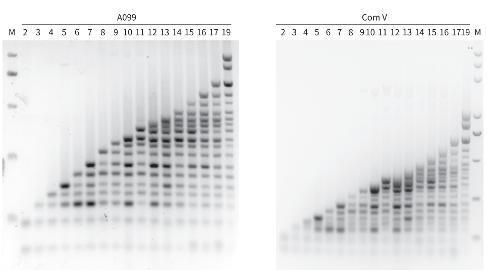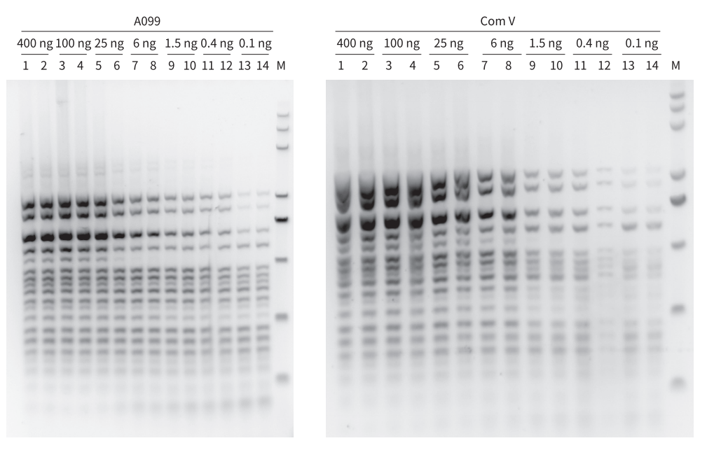 以 Human 基因組為模板,同時擴增 19 個目的片段。結果顯示,A099 最低檢測限可達 0.1 ng,不會出現條帶丟失且條帶清晰優(yōu)于 Com V