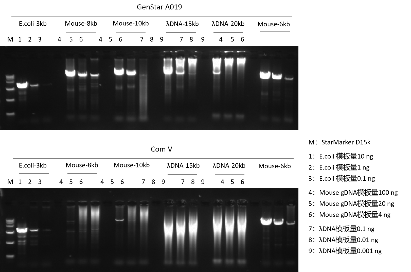 以 E.coli gDNA、Mouse gDNA、λDNA 為模板,使用 A019 和 Com V 進(jìn)行不同長度片段的擴(kuò)增。結(jié)果顯示,A019 對不同種屬來源的長片段擴(kuò)增能力強(qiáng),且優(yōu)于 Com V