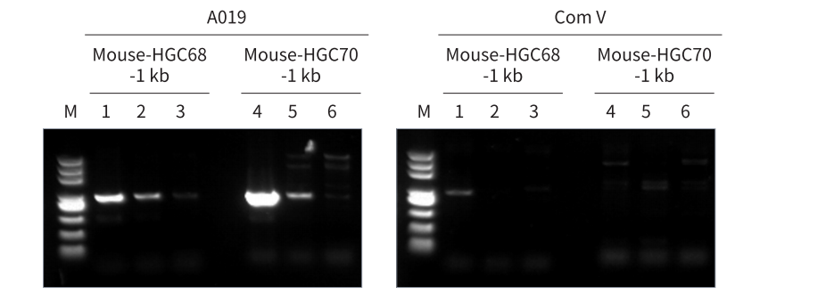 以 Mouse gDNA 為模板,使用 A019 和 Com V 進(jìn)行高 GC 片段的擴(kuò)增。結(jié)果顯示,A019 對高 GC 片段的擴(kuò)增能力強(qiáng),且優(yōu)于 Com V