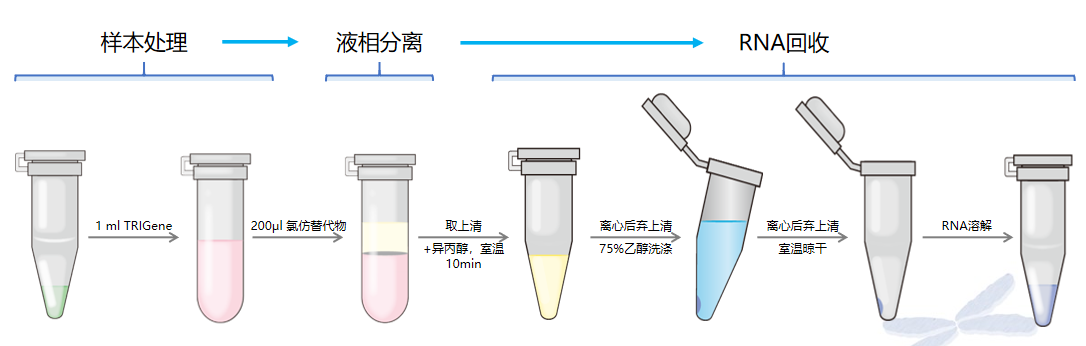 TRIGene Plus 是基于 TriZol 原理制備的一種通用總 RNA 提取試劑。其原理是利用異硫氫酸胍/酚,快速裂解細胞,溶解細胞內(nèi)含物,抑制核酸酶活性;而后加入 RNA 抽提試劑(RNA Extraction Reagent)去除雜蛋白,RNA 保留在上層水相中,分離后可用異丙醇沉淀回收獲得。采用 RNA Extraction Reagent 替代了氯仿進行 RNA 抽提,上下分相更加清晰且操作安全性更高。使用本產(chǎn)品提取 RNA 純度高,完整度好,產(chǎn)量媲美傳統(tǒng)氯仿法抽提,可直接用于 RT-PCR、Northernblot、dotblot、polyA 篩選、體外翻譯、RNase 保護實驗和分子克隆等一系列操作。