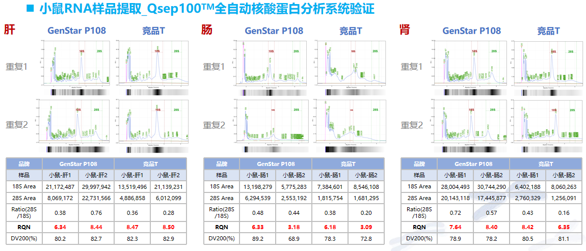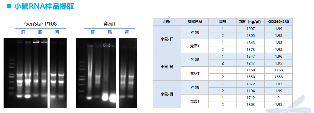 P108 可有效對小鼠不同器官組織進行 RNA 提取,其提取得率與競品 T 相當,提取的 RNA 完整度優(yōu)于競品 T。