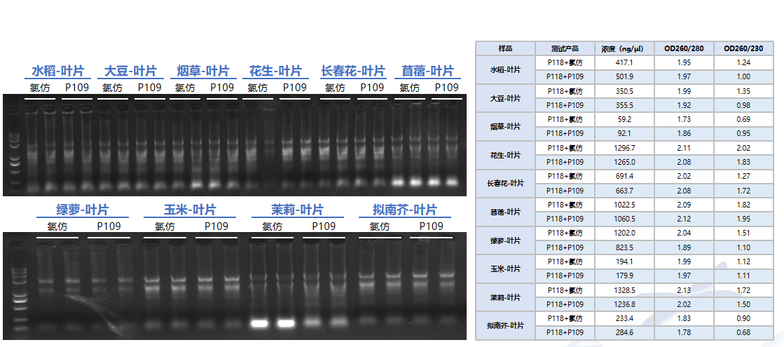 P108 采用 TRIGene +氯仿替代物,對于多種不同植物類型,其提取效果與使用氯仿的相當,可在 RNA 抽提時,代替氯仿使用。