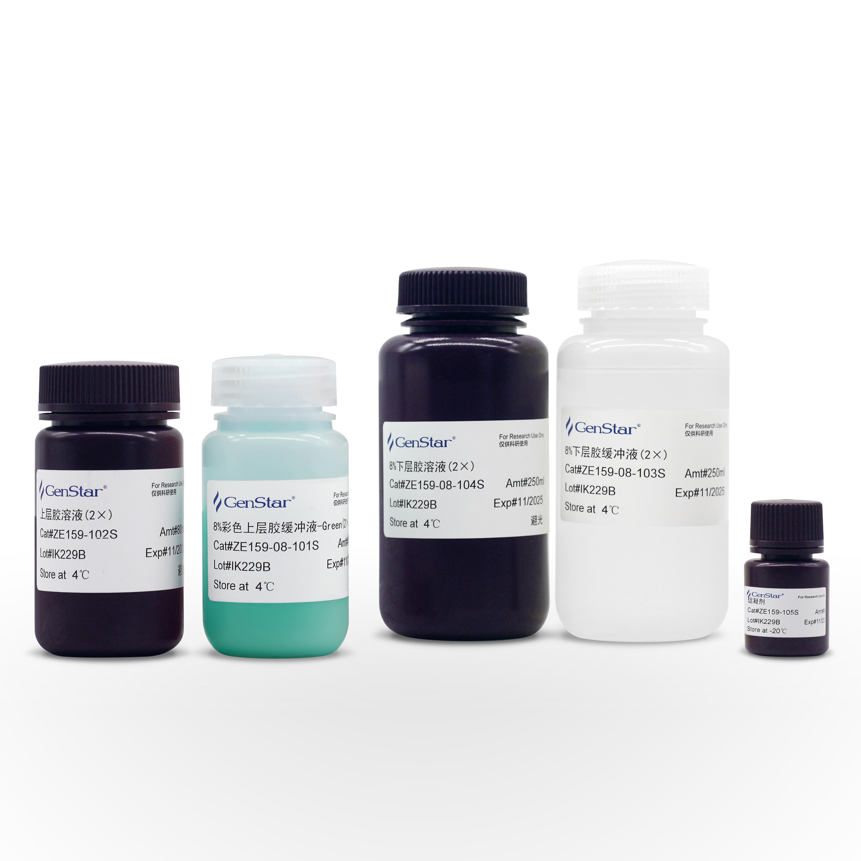 SDS-聚丙烯酰胺凝膠電泳(SDS-PAGE)是目前電泳法變性分離蛋白質(zhì)的主要方法。8% SDS-PAGE 凝膠超快速制備試劑盒采用上層膠和下層膠的預(yù)混配方,只需加入促凝劑即可凝膠,簡(jiǎn)便快捷。其中上層濃縮膠帶有淡綠色,點(diǎn)樣孔清晰易辨,便于上樣。極大程度上簡(jiǎn)化了凝膠制備操作流程,降低了實(shí)驗(yàn)人員接觸劇毒試劑的機(jī)率,具有快速、方便、安全、穩(wěn)定等特點(diǎn)。本試劑盒約可配制 125 塊(mini 型0.75 mm)大小的 8% SDS-PAGE 凝膠。具體與配制的凝膠數(shù)量和凝膠的厚薄、大小以及操作手法有關(guān)。