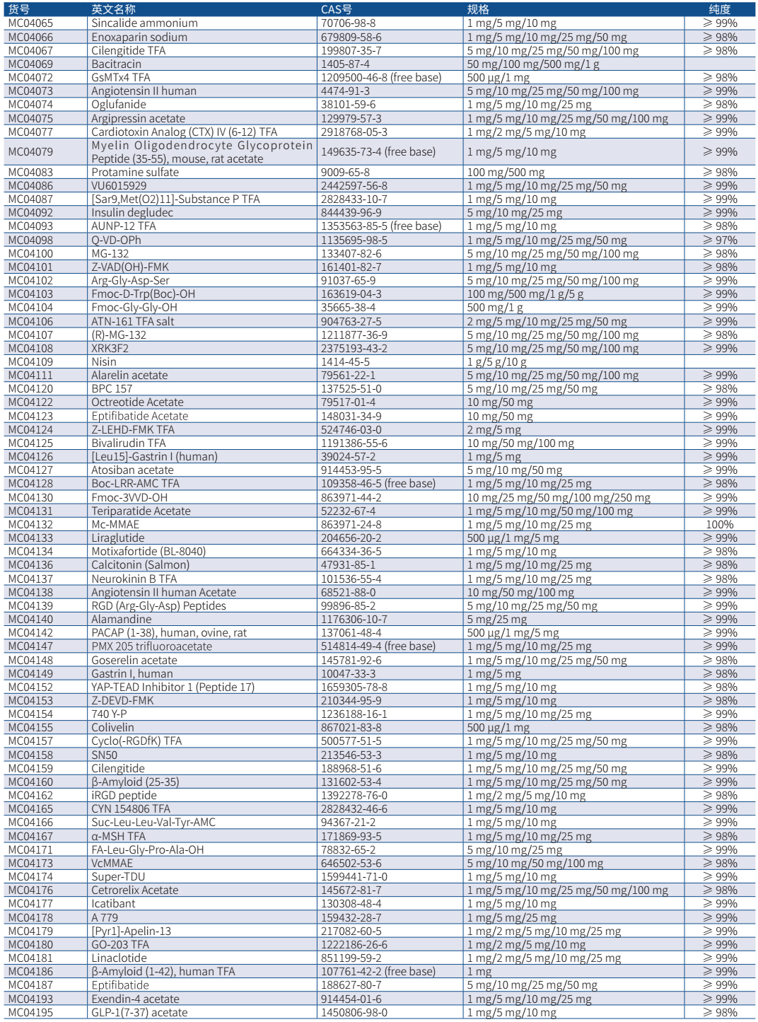 多肽是以氨基酸為基本單位,經肽鍵連接在一起形成的化合物。肽是人體重要的生理調節(jié)物,可全面調節(jié)人體生理功能,增強和發(fā)揮人體生理活性,具有重要的生物學功能。目前被廣泛用于疾病研究、藥物及疫苗開發(fā)等領域中。