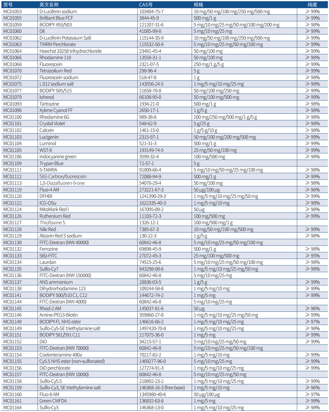 熒光染料是指吸收某一波長的光波后能發(fā)射出另一波長大于吸收光的光波的物質(zhì)。通過共價結(jié)合或物理吸附在所要研究物質(zhì)結(jié)構(gòu)中,借助熒光特性對被標記對象進行定性、定位以及定量分析。其在蛋白的功能研究、藥物篩選等領(lǐng)域具有廣泛的應(yīng)用。