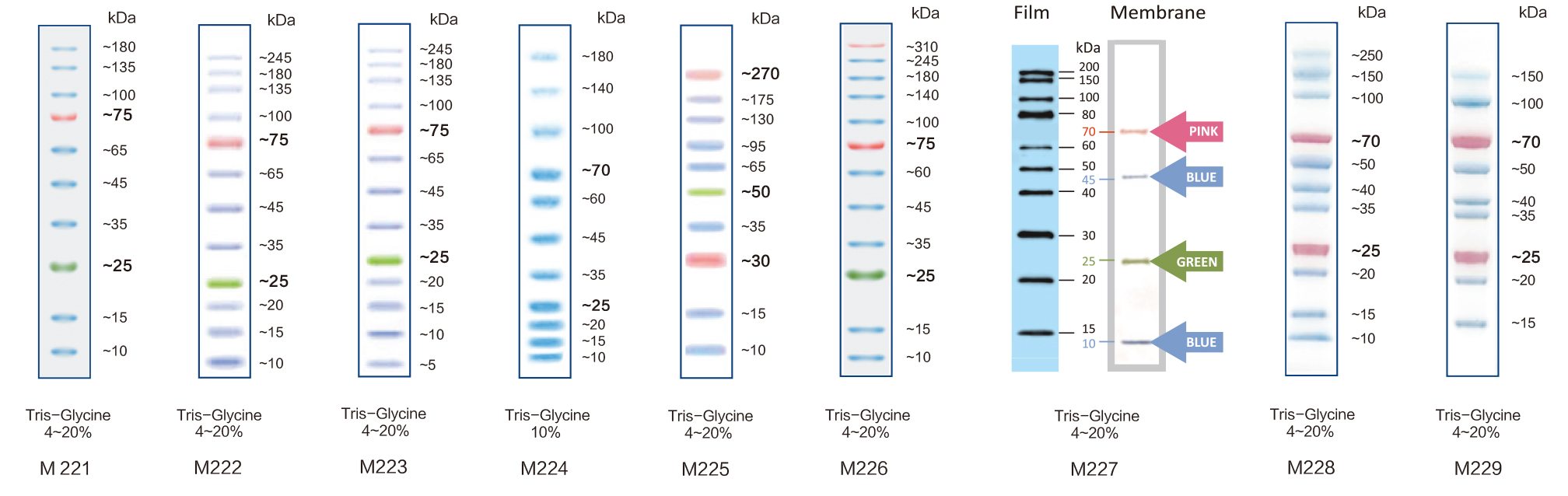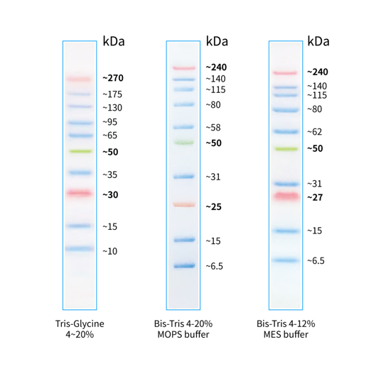 本產(chǎn)品由跨度從 10-270 kDa 的 10 種高度純化預(yù)染的重組蛋白質(zhì)組成,各條帶濃度約為 0.1-0.5 mg/ml。其中 30 kDa 和 270 kDa 條帶為加強(qiáng)條帶,方便判斷各個條帶的準(zhǔn)確位置。本產(chǎn)品適合作為 SDS-PAGE 電泳時,變性蛋白樣品的分子量參照,并可實(shí)時觀察蛋白樣品的電泳分離狀況,也可用于檢測 Western blot 的轉(zhuǎn)膜效率。由于共價結(jié)合的染料會影響蛋白質(zhì)分子的電泳遷移率,本產(chǎn)品僅適于粗略地估計目的蛋白樣品的分子量。