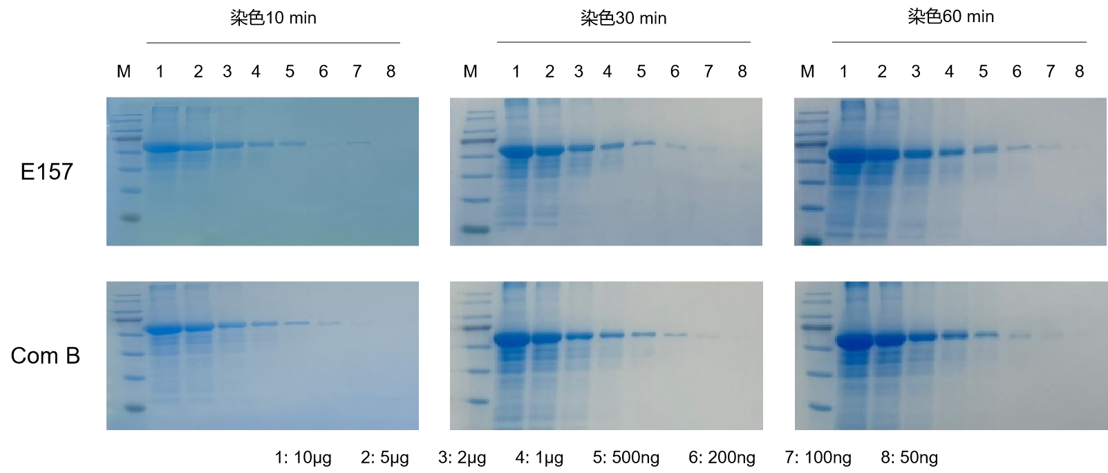 不同蛋白上樣量,經(jīng)不同時(shí)間染色及脫色后,可看到清晰的目標(biāo)蛋白條帶。結(jié)果顯示,E157 在 10 min 時(shí)可見 200 ng 條帶,30 min可見 100 ng 條帶,60 min 可見低至50 ng條帶,因此,E157染色速度快、靈敏度高。