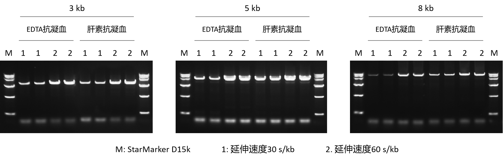 以濃度為 10% 的人全血為模板,使用 A161 進(jìn)行 PCR 擴(kuò)增,延伸時(shí)間分別設(shè)置為 30 s/kb 和 60 s/kb,電泳結(jié)果顯示,延伸時(shí)間為 30 s/kb 即可擴(kuò)增出不同長(zhǎng)度的目的條帶,延伸時(shí)間越長(zhǎng),擴(kuò)增產(chǎn)物量越大,當(dāng)擴(kuò)增片段長(zhǎng)度 ≥5 kb,建議延伸時(shí)間設(shè)置為 60 s/kb。