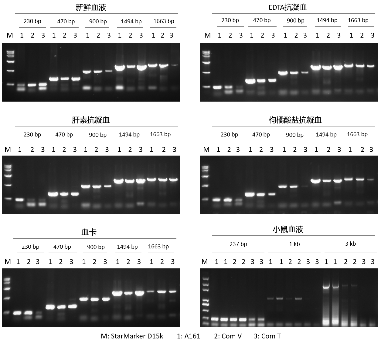以人的新鮮血液、常規(guī)的抗凝血(EDTA、肝素、枸橘酸鹽)、血卡、小鼠新鮮血液為模板,分別使用 A161、Com V 和 Com T 進(jìn)行 PCR 擴(kuò)增。結(jié)果顯示,A161 具有超強(qiáng)的抑制劑耐受性,可對(duì)不同類型血液樣本進(jìn)行 PCR 擴(kuò)增,且擴(kuò)增性能優(yōu)于 Com V 和 Com T。