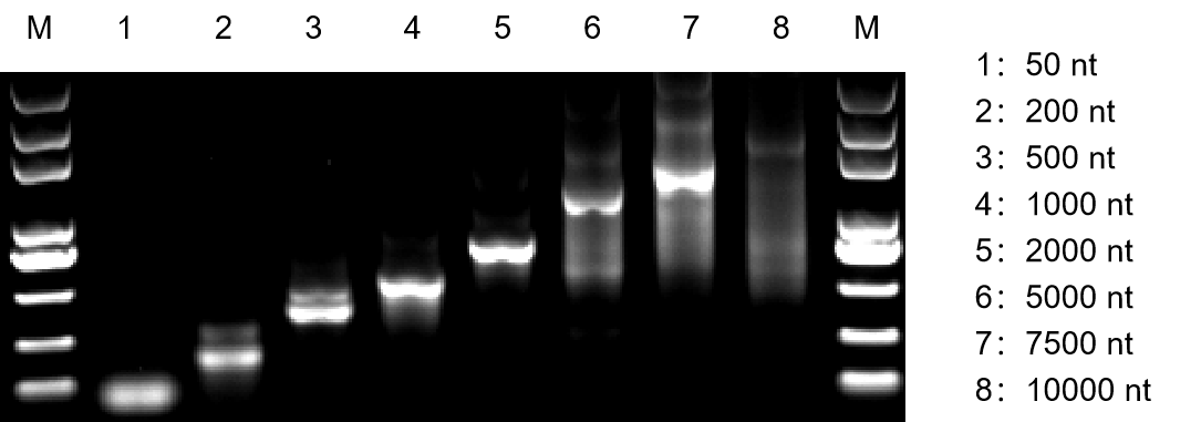 GenStar #R101 可高度特異識(shí)別 T7 啟動(dòng)子序列,能夠合成 50-10000 nt 的 RNA 產(chǎn)物。